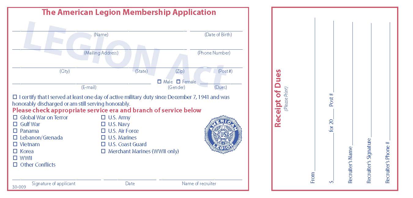 - Mail the application, a COPY of your DD Form 214 or other record of honorable service, and a Personal Check, Money Order or Cashiers Check for the local post dues to the Post Adjutant at the address listed for your local post.